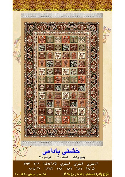 گلیم فرش ماشینی ۴۰۰ شانه آکرلیک کاشان- طرح خشتی بادامی